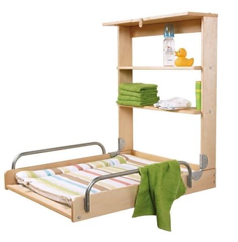 Table à langer murale avec beaucoup d'espace de rangement et facilement pliable.