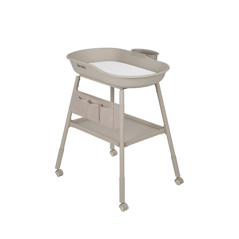 Table à langer mobile Lionelo Rosie avec roulettes, rebords hauts, étagère inférieure et rangement latéral. Stable et facile à déplacer.