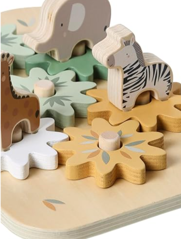 Tablette des engrenages en bois avec des petits animaux choupinous que bébé pourra soulever, tourner, encastrer...