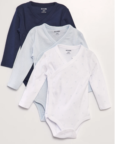 Un lot de bodies pratique pour préparer la venue de bébé ! - Lot de 3 bodies fantaisie - Forme croisée - Manches longues - Ouverture entrejambe + poitrine à pressions - 1 motif all-over - 1 imprimé placé - 1 rayé all-over