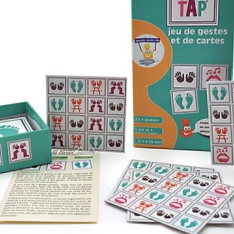 Tam Tap est un jeu conçu par un enseignant spécialisé pour développer l'enchaînement, en rythme, de gestes moteurs simples comme taper des mains, des pieds, à la lecture des symboles. Il développe la concentration, la mémorisation et la socialisation. Il aborde également l’encodage et la lecture des symboles de gauche à droite. 60 cartes épaisses. Dim. 8 x 8 cm. Dès 5 ans.