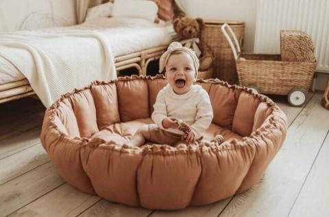 Habitant dans un appartement à Bruxelles, nous ne pourrons pas nous munir d'un parc faute de place. Nous avons donc opté pour ce beau tapis de jeu en forme de fleur, qui peut se transformer en nid douillet et sécurisé lorsque les pétales sont fermés.