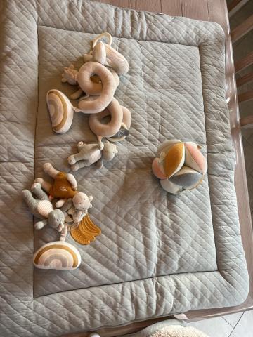 Tapis de parc et autres accessoires de chez Noukie’s, tous de la même marque, pour créer un bel ensemble assorti.