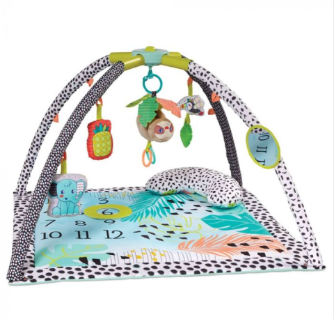 Le tapis d'éveil 4-en-1 Milestones & Memories Twist & Fold d'Infantino transforme n'importe quelle pièce en un paradis de jeu pour les petits. Ce tapis de jeu a tout ce qu'il faut pour que votre enfant soit diverti pendant des heures. Il comprend un coussin pour passer du temps sur le ventre, un tapis de jeu coloré, un miroir "peek-a-boo" et quatre joyeux personnages. Sur le tapis de jeu, les mois sont représentés afin que vous puissiez prendre une jolie photo de votre petit chaque mois. Un anneau est inclus pour indiquer le bon mois. Les quatre peluches peuvent également être utilisées séparément du tapis de jeu Infantino, par exemple pour égayer le siège-auto ou la poussette. Grâce au principe Twist & Fold, les arceaux de jeu peuvent être repliés rapidement, ce qui vous permet d'emporter facilement le tapis de jeu lors de vos déplacements. Grâce au tapis de jeu, les enfants seront stimulés visuellement et motivés pour ramper et s'agripper.