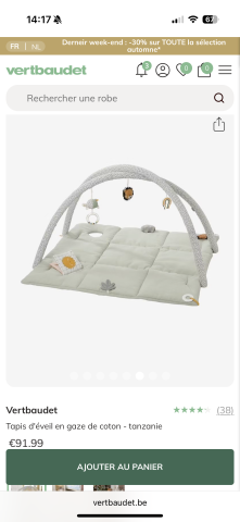 Ce produit est extrait d'une liste de naissance déposée sur Kadolog. Kadolog permet de créer des listes de naissance en toute liberté. Il est possible d'ajouter toutes vos envies cadeaux et de recevoir les dons directement sur votre compte. Avec les dons reçus, vous êtes alors libre d'aller acheter vos produits (comme ce 'Tapis d’éveil ') où et quand vous le souhaitez.