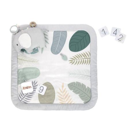 un traversin de support éléphant pour jeux sur le ventre avec des oreilles crissantes et des étiquettes sensorielles, un miroir pour découvrir les reflets et un anneau de dentition.