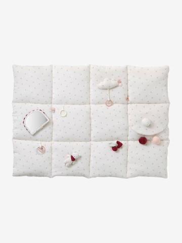 Sur ce joli tapis d'éveil moelleux, bébé fera mille et une découvertes ! Un miroir, des jouets en volume, des rubans... tout a été pensé pour stimuler ses sens