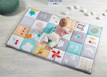 Un grand tapis d'éveil sans arche pour que bébé puisse jouer, s'allonger, s'asseoir et se retourner en toute sécurité ! De nombreuses activités pour l'éveil de bébé : anneau de dentition, miroir détachable, anneaux en plastique et formes bruissantes. Tapis