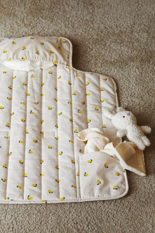 Tapis à langer en tissu de coton matelassé avec imprimé all-over. Modèle repliable offrant un espace confortable pour le change lorsque vous êtes à l'extérieur. Trois poches pour l'essentiel, dont une avec ouverture élastique. Fermeture auto-agrippante sur l'arrière. Dimensions une fois replié 16x30 cm.
