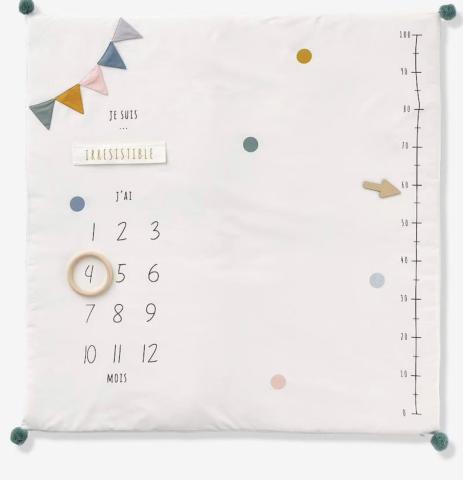 Photographiez la croissance de bébé mois après mois avec ce joli tapis de sol ! Le petit : il se personnalise ! Un anneau pour entourer l'âge, une flèche pour indiquer la taille et 6 étiquettes textiles avec des a
