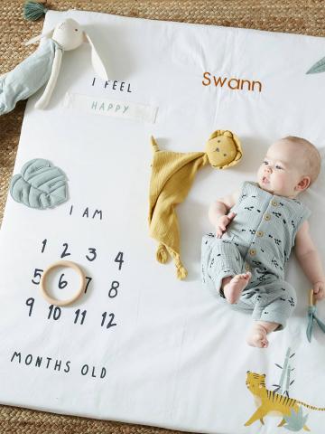 Hello joli baby ! Photographiez la croissance de bébé mois après mois avec ce joli tapis de sol ! Le petit + : il se personnalise ! Un anneau pour entourer l'âge, une flèche pour indiquer la taille et 6 étiquettes t