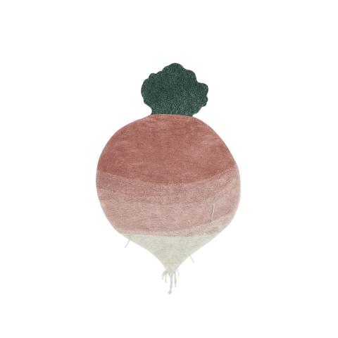 Tapis lavable en coton en forme de gros radis, dans des tons roses associés à de l'ivoire et des feuilles vertes sur le dessus.