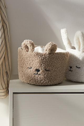 Een opbergmandje van zachte teddy met applicaties en geborduurde details. Gevoerd. Hoogte 13 cm. Diameter 15 cm.