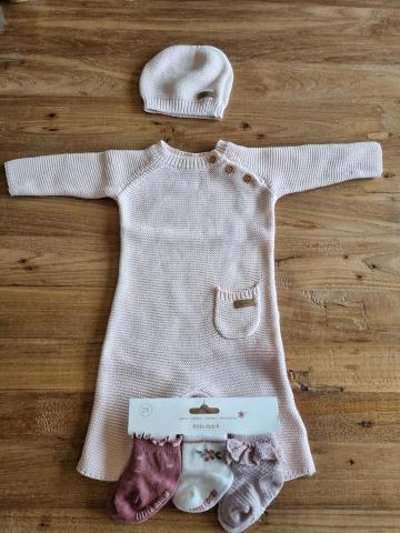 Tenue composée d'une barboteuse et d'un bonnet en tricot (seconde main) ainsi que d'un pack de chaussettes (neuf)