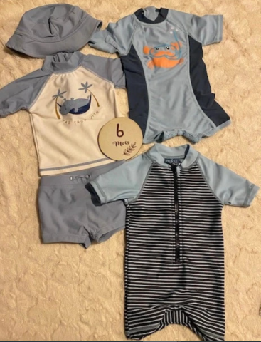 Ensemble de tenues anti UV achetées en seconde main pour protéger notre petit Lucas du soleil 2024!!! L'été à la plage on adoooore !!!! <3