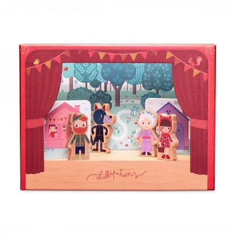 Théâtre en carton qui est lui-même la boîte du jouet. Sur le thème du Chaperon rouge avec le chaperon, le loup, la grand-mère, le chasseur + batonnets et décors : METADESCRIPTIONTXT