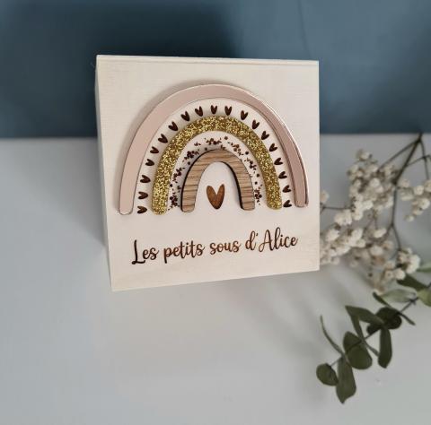 en toute liberté. Il est possible d'ajouter toutes vos envies cadeaux et de recevoir les dons directement sur votre compte. Avec les dons reçus, vous êtes alors libre d'aller acheter vos produits (comme ce 'Tirelire enfant arc en ciel personnalisée en bois différents coloris