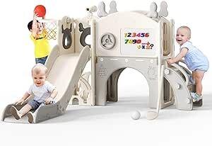 Tobogán de Alce navideño,tobogán para niños pequeños 10 en 1,con aro de Baloncesto,Estructura de Escalada,telescopio,Arco para Gatear,Golf,Tablero de Dibujo,tobogán Extra Largo de 1570 mm(Beige-Gris) : Amazon.es: Juguetes y juegos