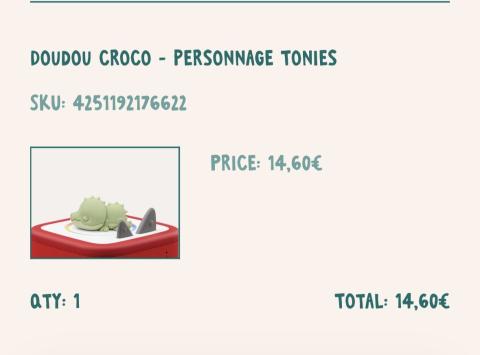 Ce produit est extrait d'une liste de naissance déposée sur Kadolog. Kadolog permet de créer des listes de naissance en toute liberté. Il est possible d'ajouter toutes vos envies cadeaux et de recevoir les dons directement sur votre compte. Avec les dons reçus, vous êtes alors libre d'aller acheter vos produits (comme ce 'Tonies crocodile 🐊 ') où et quand vous le souhaitez.