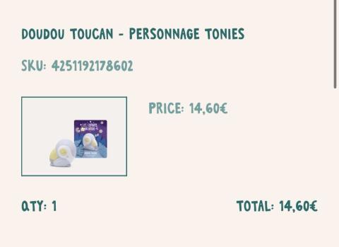 Ce produit est extrait d'une liste de naissance déposée sur Kadolog. Kadolog permet de créer des listes de naissance en toute liberté. Il est possible d'ajouter toutes vos envies cadeaux et de recevoir les dons directement sur votre compte. Avec les dons reçus, vous êtes alors libre d'aller acheter vos produits (comme ce 'Tonies Toucan ') où et quand vous le souhaitez.