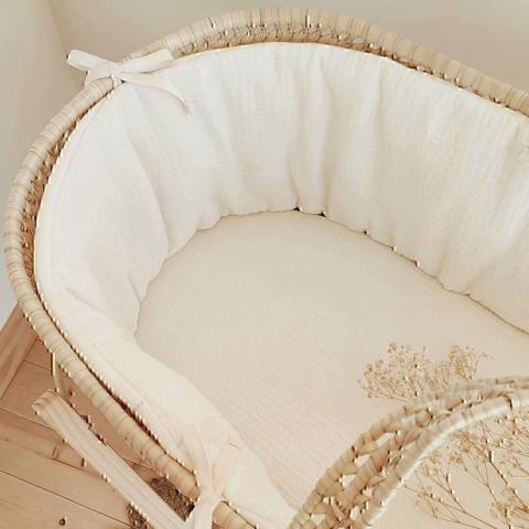 Habillage tour de couffin bébé en double gaze de coton BIO écru Fabriqué en France. S'adapte aux contours de couffins en fibres naturelles, osier ou rotin. Cocon protecteur et douillet.