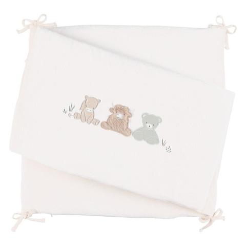 Ce tour de lit réversible, dans une teinte ecru, aux coloris doux et apaisants, crée une ambiance sereine dans la chambre de bébé. Il est décoré de broderies représentant les tendres petits personnages du thème Fluffy, Orso & Lily, apportant une touche chaleureuse et soignée à l’ensemble.