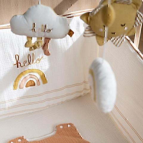 TOUR DE LIT SUNLIGHT : Ce tour de lit Sunlight s'adapte au lit 120x60cm ou 140x70cm. Chaleureux, les motifs et les couleurs du thème Sunlight apportent un style au lit de bébé. Son design coloré et chaleureux apportera une touche de décoration à la chambre de votre enfant.