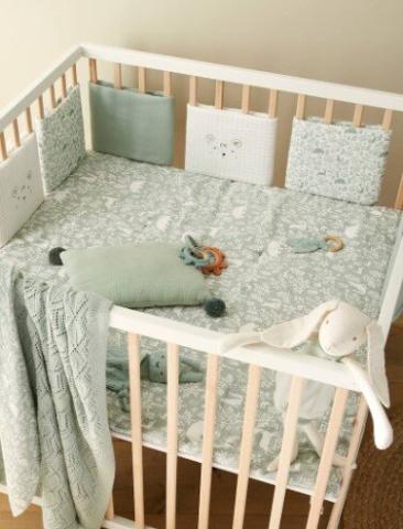 A la fois déco, confortable et anti choc, le tour de lit / tour de parc rassure les enfants en les entourant de douceur et en reproduisant le cocon de la maternité. Bébé pourra s’éveiller en toute sécurité, sans risquer de se cogner contre les barreaux.