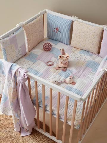A la fois déco, confortable et anti choc, le tour de lit / tour de parc rassure les enfants en les entourant de douceur et en reproduisant le cocon de la maternité. Bébé pourra s’éveiller en toute sécurité, sans risquer de se cogner contre