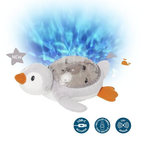 Tranquil Penguin™ est une jolie veilleuse musicale qui diffuse de douces lumières et projette sur le plafond de la chambre un effet un effet de lumière polaire sous marine en mouvement grâce à un mécanisme unique et breveté. Tranquil Penguin™ apaise bébé dès sa naissance et rassure les enfants qui ont peur du noir.