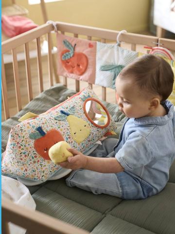 Avec ce triangle en tissu, bébé part à la découverte des couleurs, des textures et éveille ses sens avec de multiples activités. 3 faces remplies de détails intrigants : miroir, velours, papier crissant... et un jeu