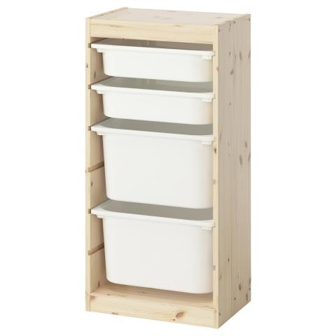 TROFAST combinaison structure + bacs, pin teinté blanc clair/blanc, 44x30x91 cm Les enfants ont besoin de rangements spacieux pour leurs affaires. La série TROFAST est composée de caissons en bois, de rangements en filet et de bacs en plastique (min. 50 % recyclés). Facile à tirer vers soi, à transporter et à remettre en place.