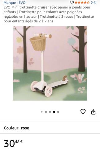 Ce produit est extrait d'une liste de cadeaux (Anniversaire, Noël, ...) déposée sur Kadolog. Kadolog permet de créer des listes de cadeaux (Anniversaire, Noël, ...) en toute liberté. Il est possible d'ajouter toutes vos envies cadeaux et de recevoir les dons directement sur votre compte. Avec les dons reçus, vous êtes alors libre d'aller acheter vos produits (comme ce 'Trottinette 3 roues - rose ') où et quand vous le souhaitez.