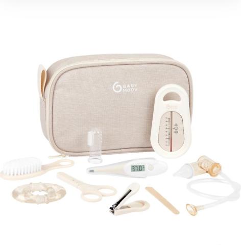9 accessoires inclus. Lime à ongle, mouche bébé, anneau de dentition, brosse à cheveux, brosse à dent, thermomètre de bain, thermomètre digital, coupe ongle et paire de ciseaux à bouts arrondis.