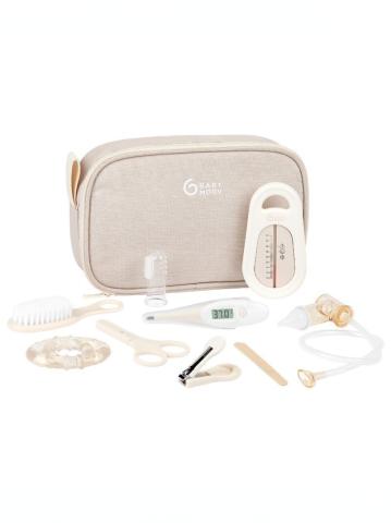 Une trousse de soin compacte et pratique pour bébé. - Trousse de soin - Fabriquée avec du tissu recyclé et un pack FSC sans plastique.- Filet intérieur avec élastiques - 9 accessoires inclus : Lime à ongle, mouche bébé par aspiration buccal (avec réservoir anti-retour de sécrétions), anneau de dentition, brosse à cheveux, brosse à dent, thermomètre de bain, thermomètre digital, coupe ongle et paire de ciseaux à bouts arrondis.