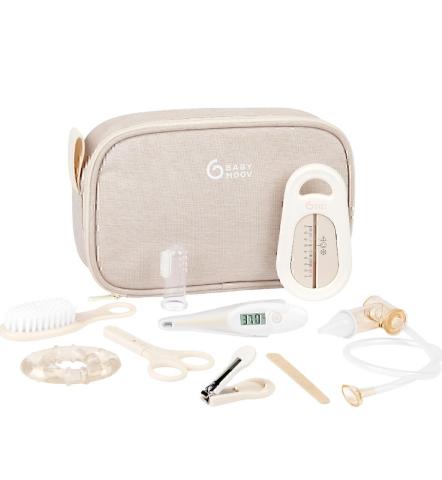 Babymoov Trousse de Soin Bébé - Compacte & Nomade - Dès la naissance - 9 Accessoires Essentiels Soin de Bébé dont Brosse à Cheveux, Thermomètre digital, Thermomètre de bain, Petit Coupe Ongles, Sable