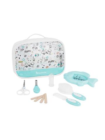 Pratique cette trousse de soin pour bébé qui contient l'essentiel pour le bain et qui est suffisamment grande pour accueillir d'autres accessoires ! Trousse de soin 'Badabulle' - Cette trousse inclut 7 accessoires : brosse, peigne, thermomètre de bain, ciseaux, coupe ongles, 4 limes à ongles, masse gencives en silicone - Ouverture zippée - Rangements intérieurs élastiqués - Poche de rangement en filet - Dimensions : L 22 x H 16 cm environ