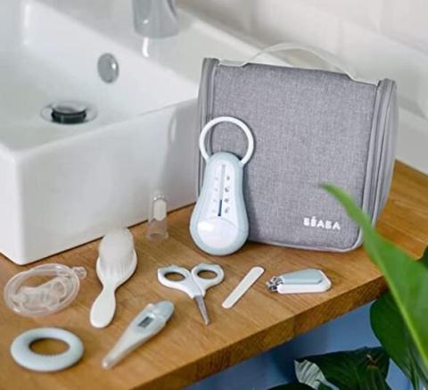 PLEIN D'ACCESSOIRES : Thermomètre de bain, thermomètre numérique, ciseaux, coupe-ongles, brosse à cheveux, anneau de dents, masseur de gencives, aspirateur nasal manuel, lime à ongles