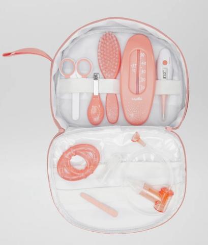 - 9 accessoires essentiels pour prendre soin de bébé: un thermomètre digital avec embout souple, un mouche bébé par aspiration buccale (avec réservoir anti-retour de sécrétions), une paire de ciseaux à bout arrondi, un coupe ongle, une lime à ongle, un thermomètre de bain, une brosse douce, un anneau de dentition réfrigérable et un masseur de gencives.