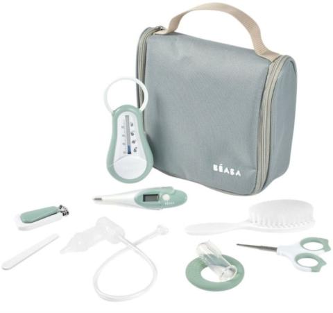 La trousse de toilette - 9 pcs de Béaba vous offrira, dès la naissance, tous les éléments essentiels pour soigner votre petit bout de chou! L'ensemble comprend un thermomètre de bain, un thermomètre digital, des ciseaux, un coupe-ongles, une brosse à cheveux, un anneau de dentition, un masseur de gencives, un mouche-bébé manuel et une lime à ongles.