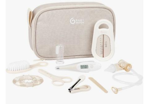 9 accessoires essentiels inclus (lime à ongle, mouche bébé, anneau de dentition, brosse à cheveux, brosse à dent, thermomètre de bain, thermomètre digital, coupe-ongles, paire de ciseaux à bouts arrondis)