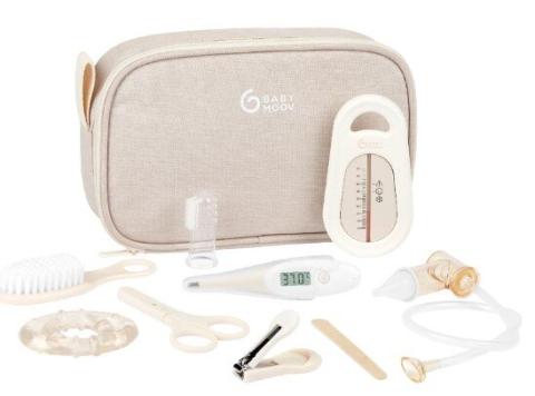 La trousse de toilette complète pour bébé  A l'intérieur retrouvez tous les essentiels pour prendre soin de votre bébé. 9 accessoires indispensables pour l'hygiène de bébé : lime à ongle, mouche bébé par aspiration buccal (avec réservoir anti-retour de sécrétions), anneau de dentition, brosse à cheveux, une brosse à