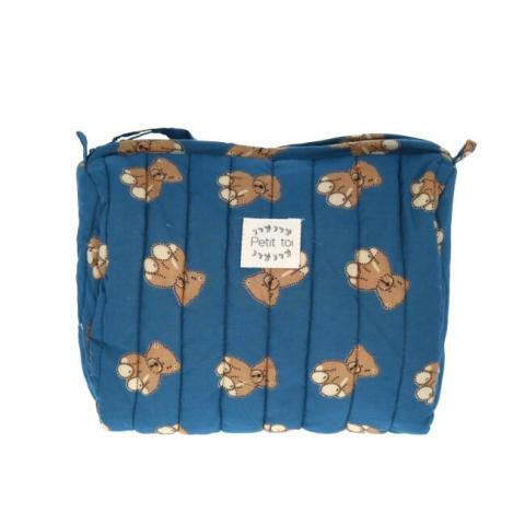Une petite trousse de toilette matelassée d'un joli bleu faite pour la toilette de bébé. Vous allez craquer pour cette adorable trousse de toilette. Assez grande pour y mettre toutes les affaires de toilette de bébé : coton, lotion, liniment et crème hy
