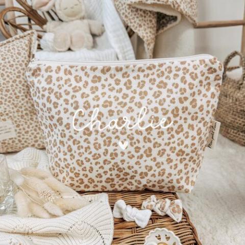 L'indispensable au quotidien : la trousse de toilette ! Oui mais pas n'importe quelle trousse de toilette !Une trousse de toilette personnalisée avec une sublime gaze de coton léopard pour une qualité incroyable ! Avec sa grande capacité, vous pourrez tout mettre dedans : couches, cotons, gel douche, parfum,...C'est une super idée de cadeau de naissance ou d'anniversaire. Une trousse de toilette qui convient aussi bien aux enfants qu'aux adultes !