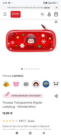 Ce produit est extrait d'une liste de cadeaux (Anniversaire, Noël, ...) déposée sur Kadolog. Kadolog permet de créer des listes de cadeaux (Anniversaire, Noël, ...) en toute liberté. Il est possible d'ajouter toutes vos envies cadeaux et de recevoir les dons directement sur votre compte. Avec les dons reçus, vous êtes alors libre d'aller acheter vos produits (comme ce 'Trousse Transparente Rigide Ladybug - WonderWow ') où et quand vous le souhaitez.