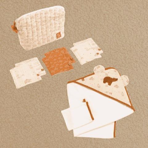 Le trousseau de bain de la collection Orsino parfait pour la maternité : une trousse garnie de carrés en éponge toute douce, une cape de bain enveloppante et un gant assorti. Tout le nécessaire pour prendre soin de bébé avec tendresse dès les premiers instants.
