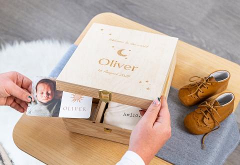 Gardez vos souvenirs les plus chers à portée de main grâce à cette magnifique boîte à souvenirs en bois. Gravée ou avec une impression colorée, cette boîte convient parfaitement pour conserver les souvenirs de votre enfant.