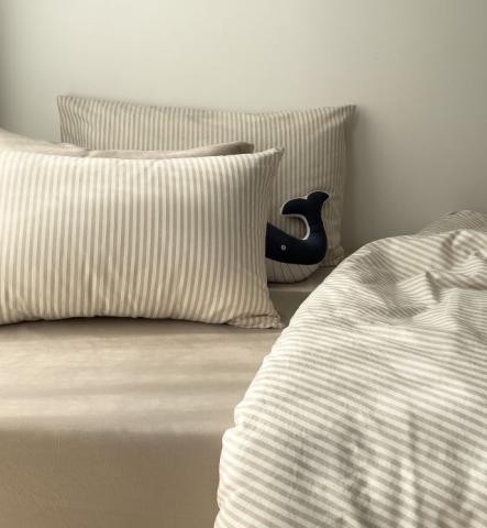 Pour la chambre de vos enfants, optez pour le style contemporain rayé avec 4 coloris doux et sobres , certifié GOTS en Percale de Coton bio pour une douceur ultime.