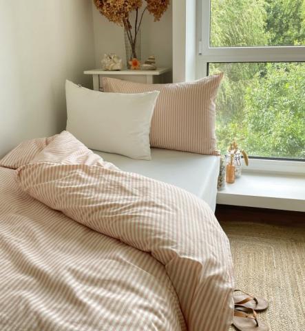 Pour la chambre de vos enfants, optez pour le style contemporain rayé avec 4 coloris doux et sobres , certifié GOTS en Percale de Coton bio pour une douceur ultime.