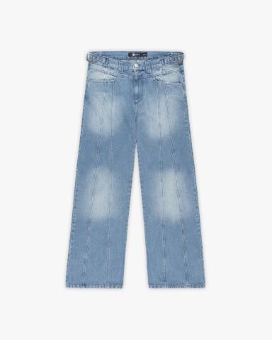High quality denim fabric Custom metal button Leather patch on the back Blue washed denim look Unique sewing line pattern V-Logo embroidery on back pockets FIT INFORMATION The model is 180 cm tall, wearing size L (32L)